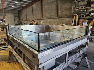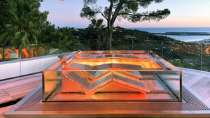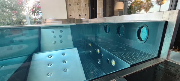 Ce spa en inox, réalisé par STEEL AND STYLE, se distingue par son angle en verre qui offre une transparence spectaculaire et une ouverture visuelle unique.